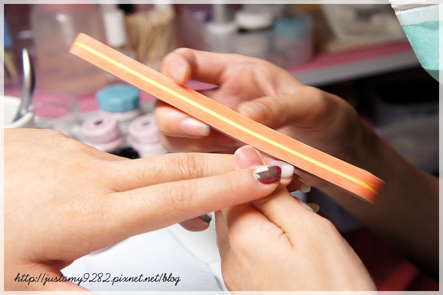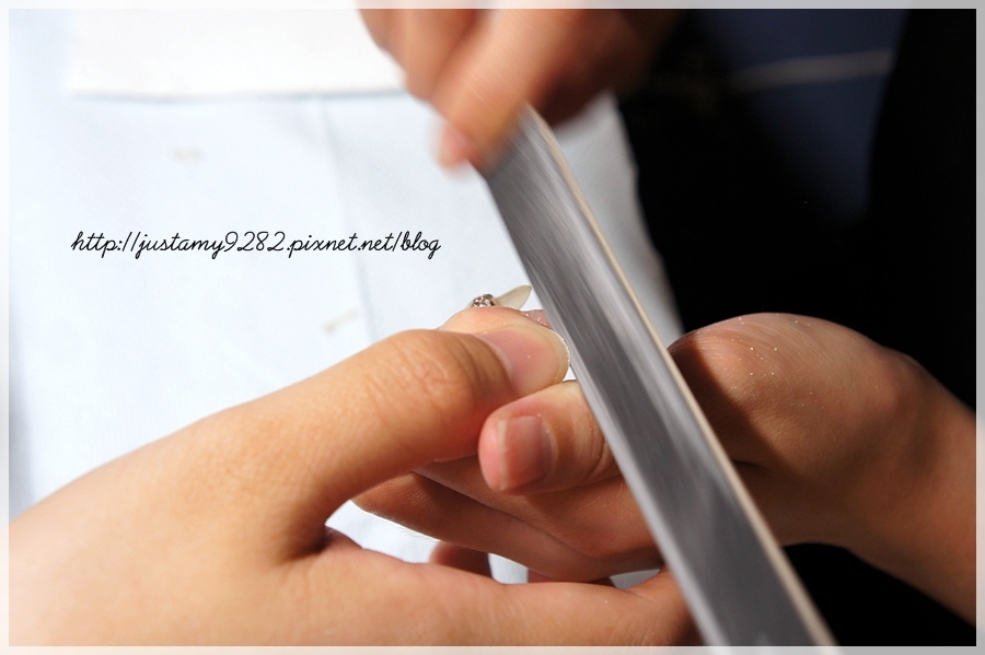 待指甲剪好後便拿出顆粒較大的磨刀將指甲的弧度修得更加完美