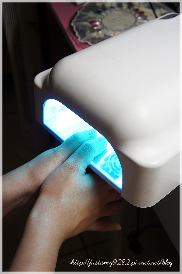 首先將雙手大拇指拼接光療完成,待會才能一股作氣完成剩下八指的彩繪